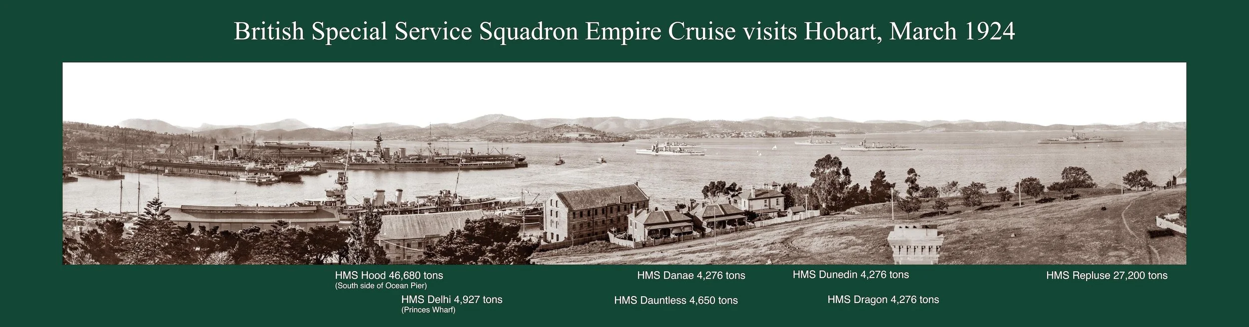 Over 35 stops, something like 11,000 miles including 8 ports in Australia. Lots of ceremonial duties, like escorting the old HMAS Australia to her final resting place, with full honours. 700,000 visitors went aboard Hood. The fleet came to Hobart and John Watt Beattie made the giant panorama that sells so well for Beattie’s Studio. The trip was a big deal, hence the photo.